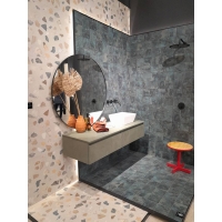 Тренд: Тераццо продолжает оставаться популярным материалом на Cersaie 2025. Керамическая плитка с эффектом терраццо, включающая мраморную крошку и крупные камни, становится акцентом в премиум-интерьерах.